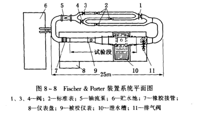 儀表制造廠早在工廠內(nèi)部采用這種高效率的校準方法。圖8-8所示是Fischer+ PoIter公司的閉合循環(huán)回路標準流量計校準裝置系統(tǒng)平面圖。3只較小口徑的標準流量計2按所需流量分別以單只(閥4開,閥l、3關(guān)),2只并聯(lián)(閥1、4開,閥3關(guān)).3只并聯(lián)(閥l、3、4開)三種方式接人循環(huán)回路。標準流量計也可以3只串聯(lián)地接人同路(閥3開,閥1、4關(guān))作相互間核對??尚首畲罂趶綖?m的電磁流量計,由于所需揚程只要2m,軸流泵5的功率只有70kw.最大流量為6000m3/h。