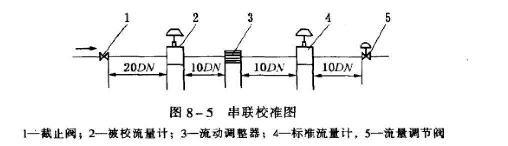 圖8-5所示是通用的一臺標準流量計(通常為渦輪流量計或電磁流量計)與技校準流量計串聯(lián)校準圖。