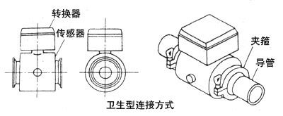 夾裝連接時近年發(fā)展的連接方式,傳感器本身無法蘭,以較長的螺栓夾持在管道兩法蘭之間接入管系。本方式傳感器體積小重量輕,對于不同壓力規(guī)范和標準管系法蘭孔距適應性強;但只適用于較小管徑(200mm一下),承受液體工作壓力較低。