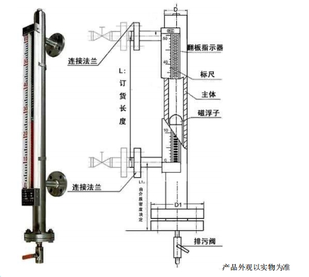 液位計(jì)是利用其內(nèi)部的磁性浮子隨液位變化產(chǎn)生的磁位移,使得 液位視窗的紅白磁翻柱作相應(yīng)的翻轉(zhuǎn)來(lái)指示液位的高度。當(dāng)浮子下降 時(shí),由紅色轉(zhuǎn)為白色,紅色始終表示液位的高低。