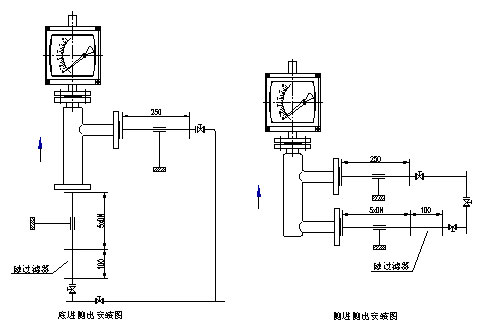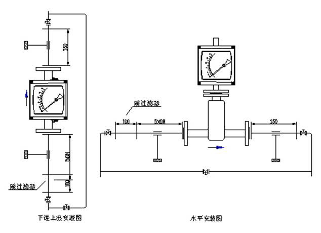 流量計(jì)垂直安裝,流量計(jì)中心線與鉛垂線的夾角不超過5°,在流量計(jì)的上游須保證五倍公稱通徑的入口直管段,下游保證250mm出口直管段。如果介質(zhì)中含有固體雜質(zhì),應(yīng)在流量計(jì)上游加裝過濾器;如果介質(zhì)中含有鐵磁性物質(zhì),應(yīng)在流量計(jì)的上游安裝磁過濾器。為了便于維護(hù)和清洗且不影響生產(chǎn),建議安裝旁通管路。為了避免由于管道引起的流量計(jì)變形,安裝法蘭必須與儀表同軸并且相互平行,并適當(dāng)?shù)刂喂艿酪员苊夤艿勒駝雍蜏p小流量計(jì)的軸向負(fù)荷,測量系統(tǒng)中控制閥應(yīng)安裝在流量計(jì)的下游。用于測量氣體時(shí),應(yīng)保證管道壓力不小于5倍流量計(jì)的壓力損失,以使浮子穩(wěn)定工作。