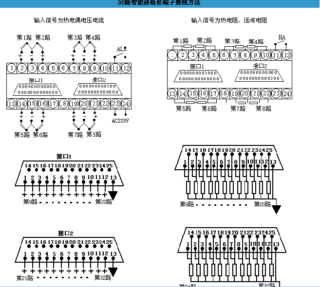 報(bào)警輸出: ⑴1-64通道統(tǒng)一上下限報(bào)警,繼電器輸出觸點(diǎn)容量 AC220V/3A